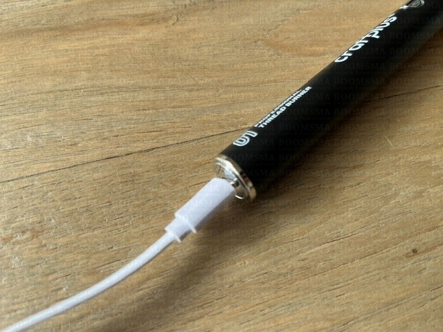 Een koperen borsteltje, om de polyester resten van het gloeidraadje te verwijderen, en een laadkabeltje met USB zijn bijgevoegd. Opgeladen gaat deze pen 2 tot 3 uur mee.