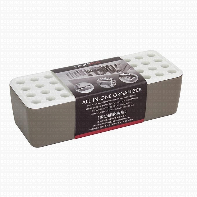Duurzame en stevige gereedschapsorganizer voor stempelgereedschap, naaitanden, vlechttanden, rondsnijmessen (swivel knives) of spindelstempels. Wordt geleverd met een afneembare bovenkant. Uitneembaar vak biedt voldoende ruimte voor groter gereedschap onderin. Handig voor vervoer (bijv. tijdens workshops op locatie).